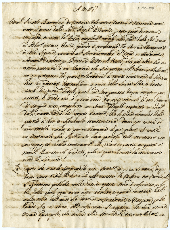 Supplica con elencazione di meriti da parte di monsignor Nicola Biancovich vescovo di Makarska per essere trasferito da quella chiesa all’arcivescovato di Zara vacante per la morte di monsignor Prioli. In alternativa supplica di poter ottenere una pensione sopra il vescovato di Traù.