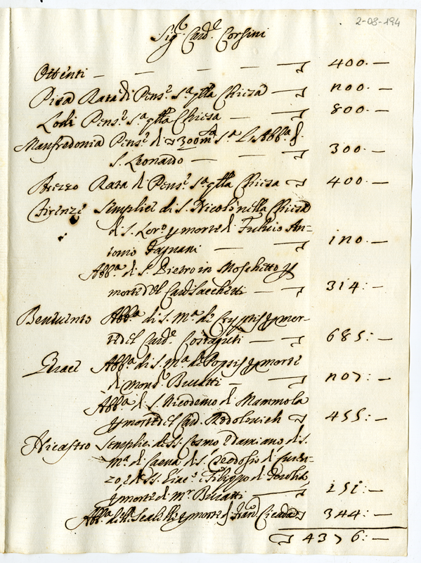 Pensioni e benefici riservate al cardinale Corsini in varie località (1706)