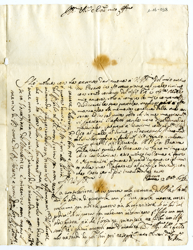 Lettera di Giulia Albani Olivieri degli Abbati a Giovanni Francesco Albani (1676 ottobre 15)