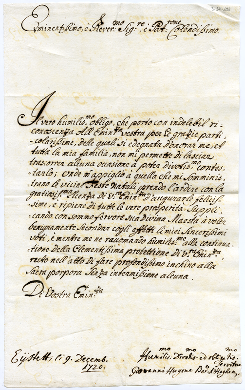 Lettera di Giovanni Hugone barone di Haghen al cardinale Annibale Albani (1720 dicembre 9)