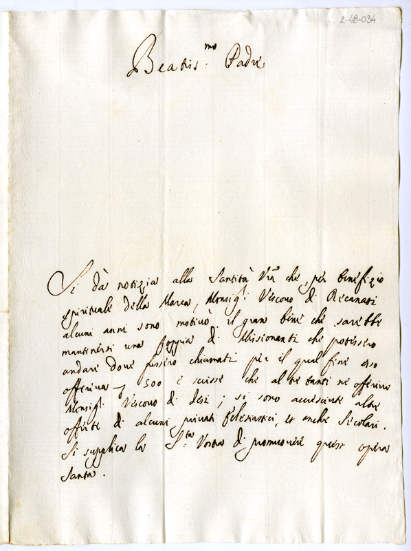 Chiede al pontefice di promuovere la elezione di una coppia di missionanti per le località di Recanati e di Iesi, per i quali è già stato previsto un beneficio