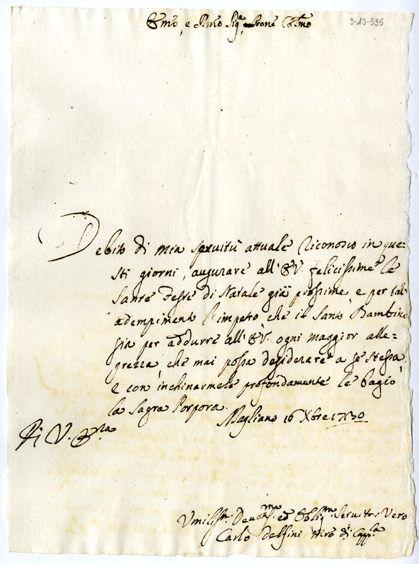 Lettera di Carlo Delfini al cardinale Annibale Albani (1730 dicembre 16)
