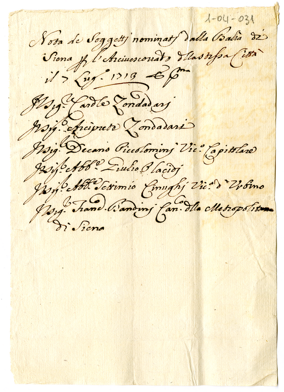 Nota de soggetti nominati dalla Balia di Siena per l'arcivescovado della stessa città il 7 luglio 1713